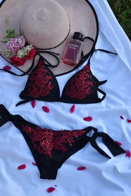 Táto elegantná plavková súprava upúta na prvý pohľad svojou výnimočnou flitrovou výšivkou, ktorá sa ligoce v slnečných lúčoch a vytvára hypnotizujúci efekt. Trblietavé zdobenie v kombinácii s premysleným strihom dodáva plavkám punc luxusu a originality.