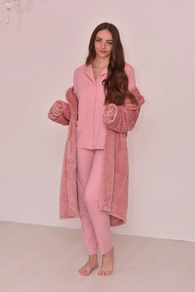 Kabátik pyžama je navrhnutý s praktickým zapínaním na gombíky, čo umožňuje jednoduché obliekanie a vyzliekanie. Tento klasický prvok dodáva pyžamu elegantný vzhľad a podčiarkuje jeho nadčasový dizajn.