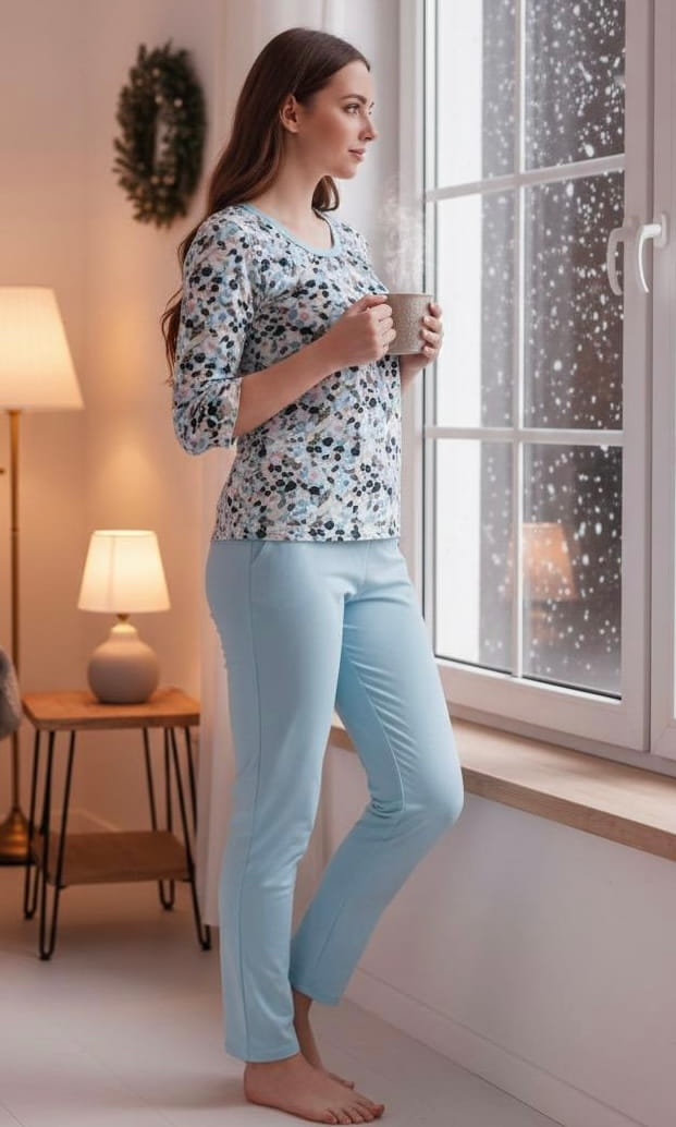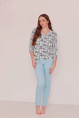 Dlhé pyžamo vyrobené z elastickej bavlny interlock, príjemnej na dotyk. Tento pohodlný set sa skladá z bledomodrého vrchného dielu s kvetinkovým vzorom a jednofarebných nohavíc.